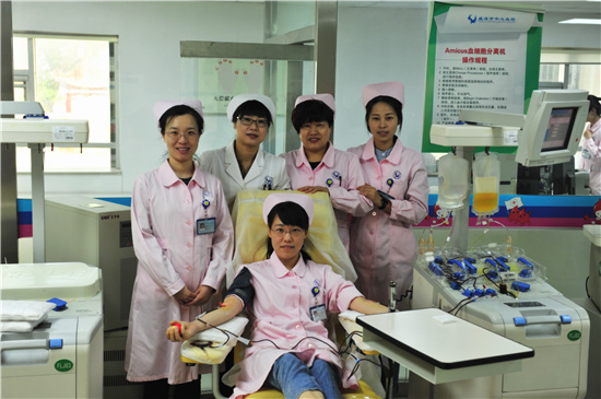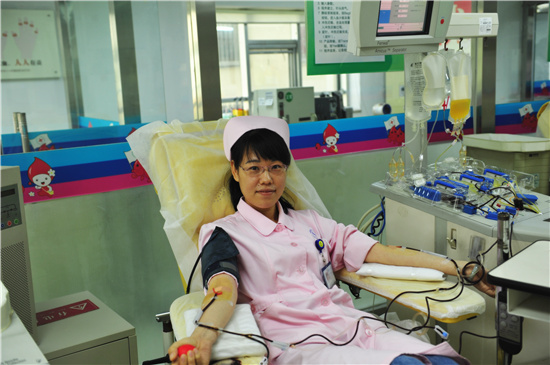 5月3日上午,血站机采大厅的工作人员正在有序地忙碌着,听说医院急需B型血小板,采血护士徐蕾艳主动提出:我是B型血,抽我的吧!